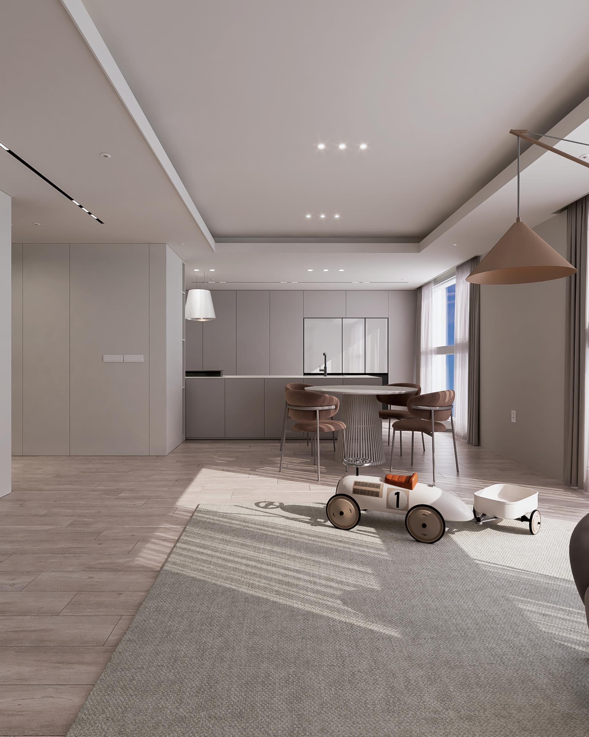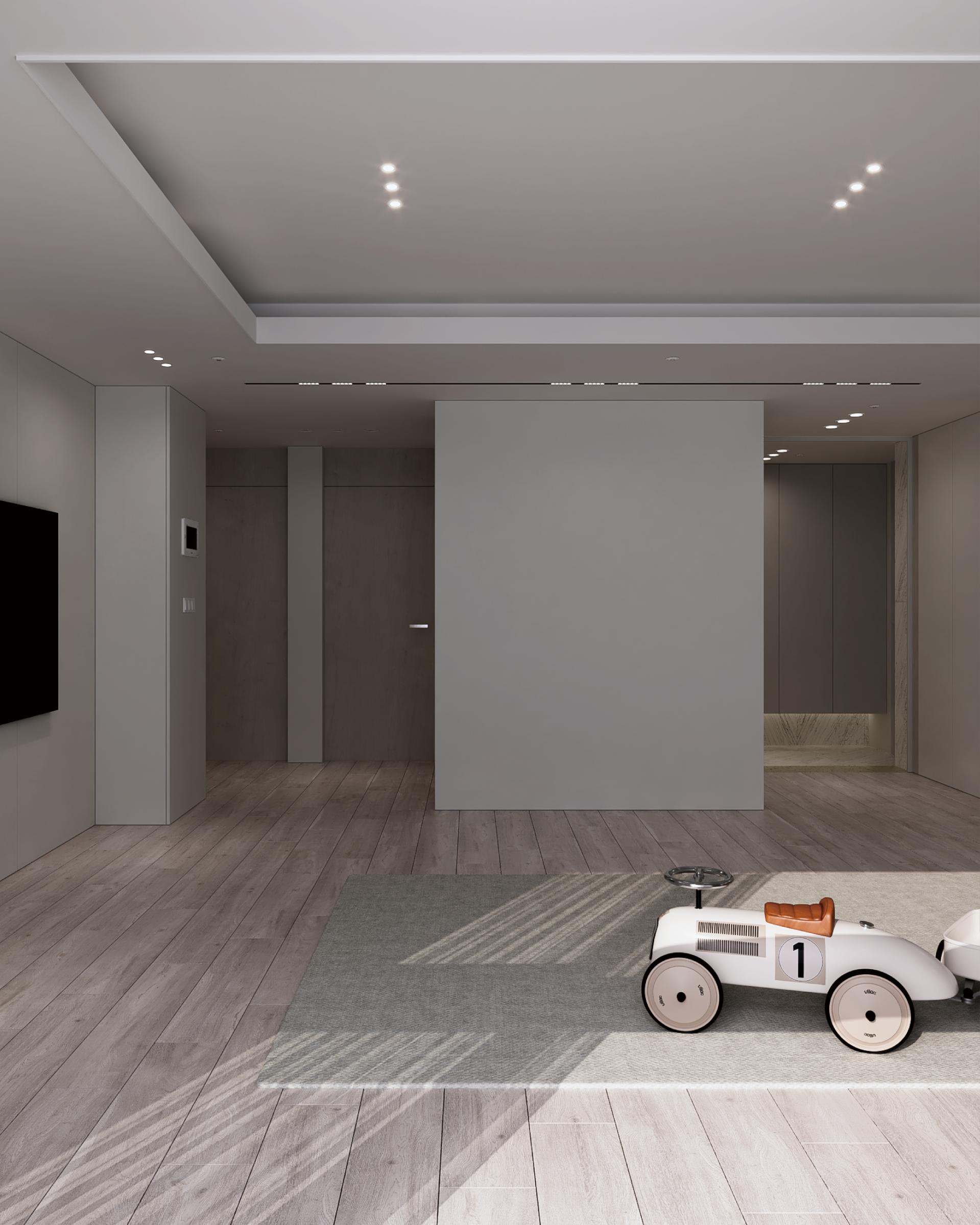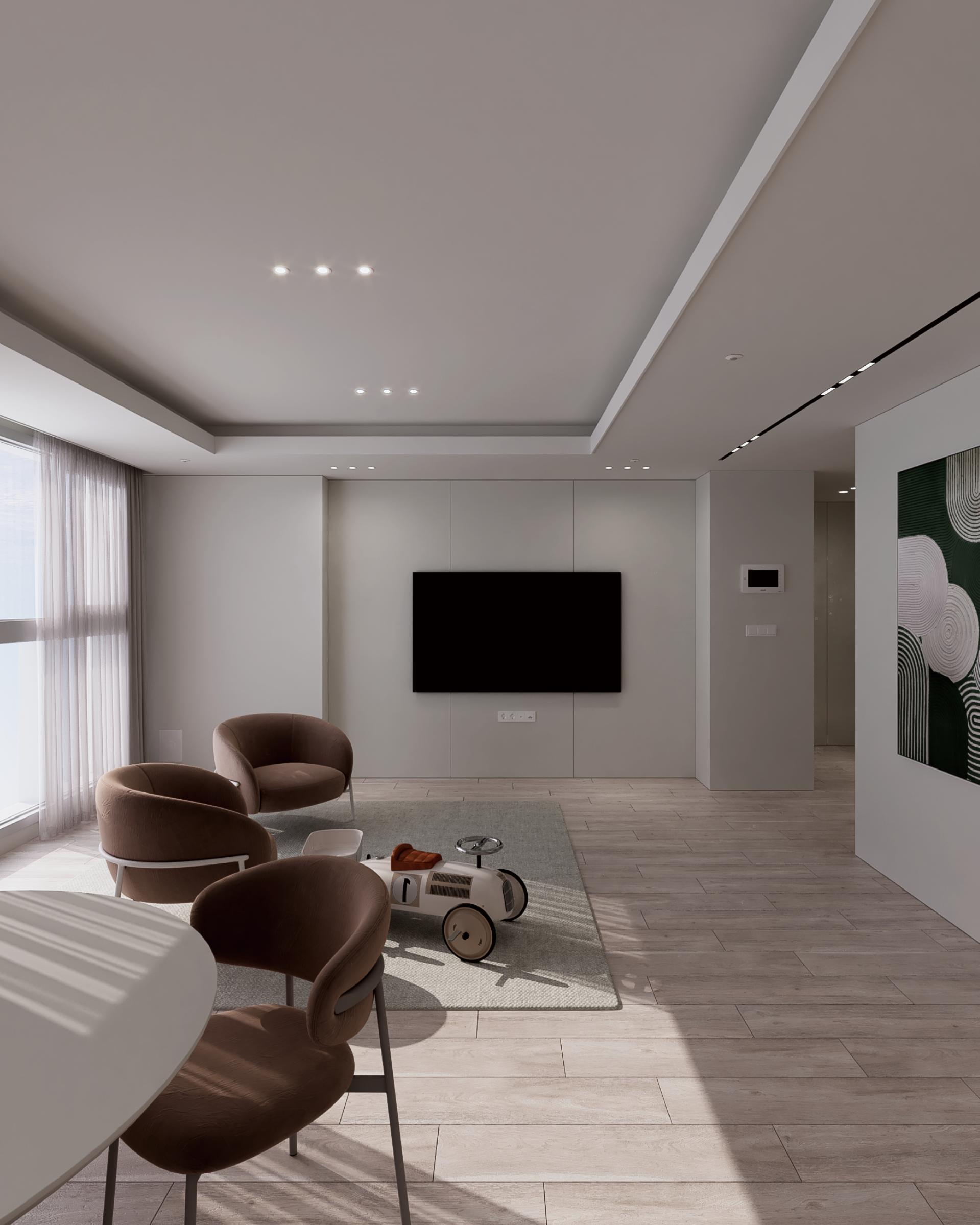 천장에는 깔끔한 라인 조명이 설치되어 공간의 깊이와 입체감을 살리며, 공간의 모던함을 한층 강조합니다.